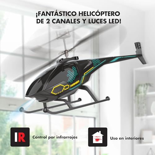 El Bizak Flybotic es un helicóptero de interior con control infrarrojo, luces LED y decoración de Mamba Negra, ideal para vuelos precisos y emocionantes.