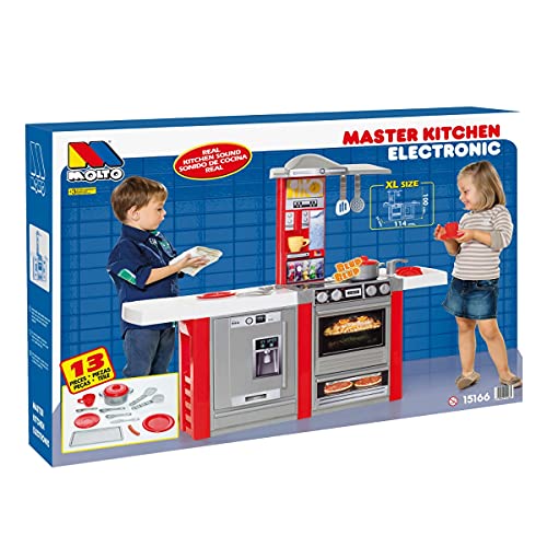Cocina a fuego lento con luces reales, equipada con horno, placa, campana, fregadero, frigorífico y 13 accesorios. Medidas 102x114x34 cm.