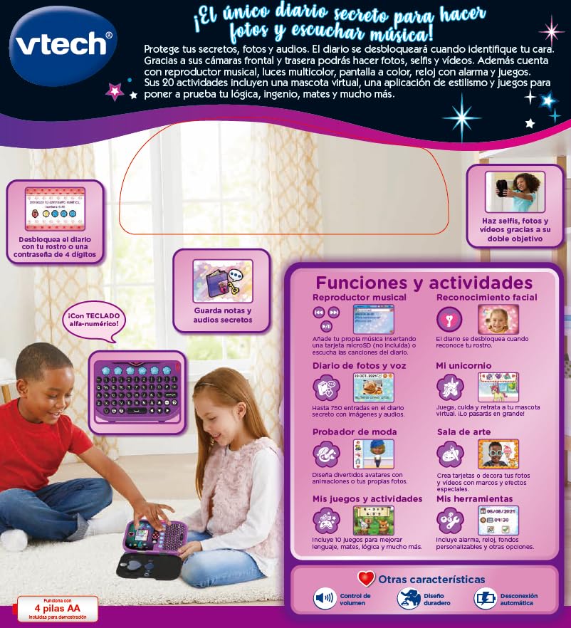 El VTech KidiSecrets negro es un diario digital seguro con teclado, cámara, lector MP3, y reconocimiento facial, ideal para guardar secretos y entretenerse.