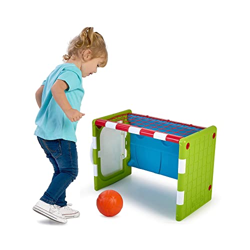 El Feber Activity Cube 4 in 1 ofrece diversión con golf, canasta, fútbol y una mesa. Incluye accesorios para cada actividad.