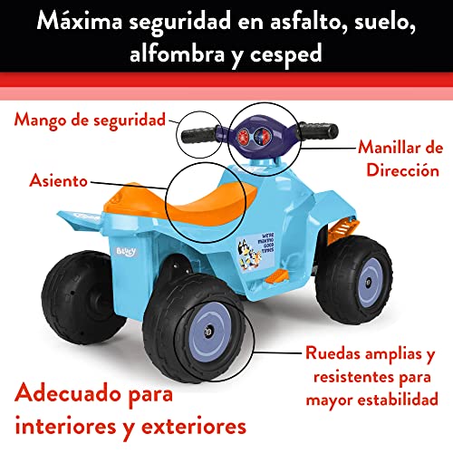 El Quad Bluey 6V de Feber es un vehículo eléctrico seguro y divertido para niños de 18 meses a 3 años, con un motor de 6V y batería para 40 minutos de juego.
