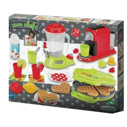 El Set de Pequeños Electrodomésticos 100% Chef de Ecoiffier incluye máquina de espresso, licuadora y plancha para gofres, con 24 accesorios para juegos creativos.