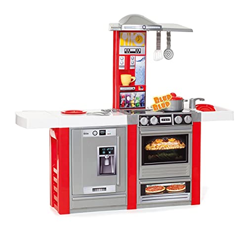 La cocina está equipada con dos módulos que incluyen un horno, placa de cocinar, campana extractora, fregadero y frigorífico. Además, cuenta con 13 accesorios que permitirán a los niños tener todo lo necesario para sus creaciones culinarias. Las dimensiones de la cocina son 102 cm de alto, 114 cm de ancho y 34 cm de profundidad, lo que la hace adecuada para espacios de juego amplios.