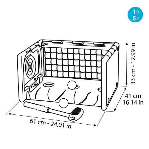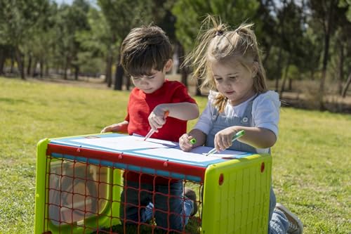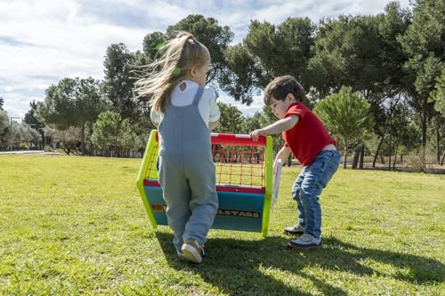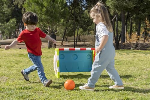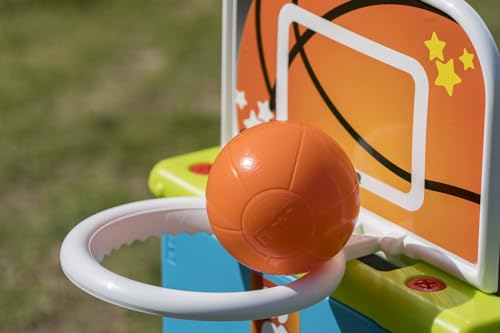 El Feber Activity Cube 4 in 1 ofrece diversión con golf, canasta, fútbol y una mesa. Incluye accesorios para cada actividad.