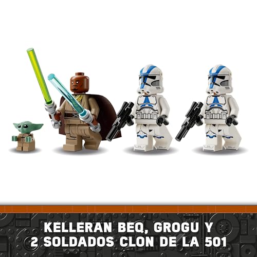 El set incluye un detallado speeder BARC con sidecar, perfecto para recrear la temeraria escena de huida de la serie. Con sus 221 piezas, este modelo no solo es un desafío para construir, sino que también es un placer para exhibir. Además, incluye tres minifiguras icónicas: Kelleran Beq con sus espadas láser azul y verde, dos soldados clon de la 501 y, por supuesto, la adorable figura de Grogu.