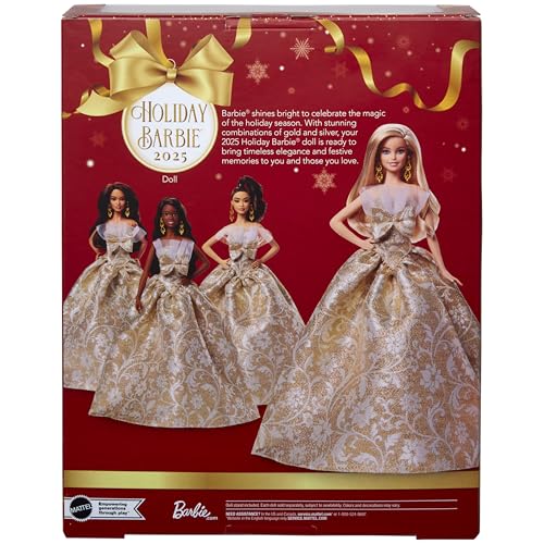 Especificaciones: Mattel – Barbie Signature Barbie Felices fiestas 2025 pelo rubio con vestido dorado y plateado Mattel.