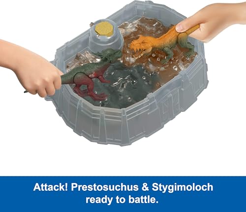 Descubre el emocionante mundo de Jurassic World con el Pack Dino Revelación de Mattel, donde los dinosaurios cambian de color al sumergirse en agua. Incluye dos figuras y un campo de batalla para una experiencia de juego única.
