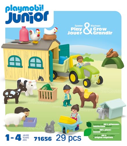 Sumérgete en la vida rural con el set de Playmobil JUNIOR: Aventura en la Granja. Incluye tractor, remolque y animales para un juego educativo y divertido.