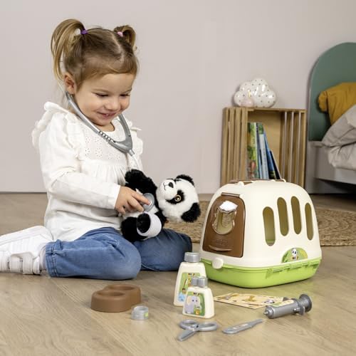 Descubre el Maletín Cuidado Animal Smoby con un panda de peluche interactivo y accesorios veterinarios, ideal para niños a partir de 3 años.