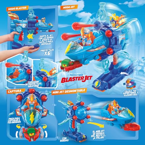 El Blaster Jet de Superthings, liderado por Kid Kazoom, ofrece acción multi-acción para enfrentar a los villanos con su transformación de vehículo a jet y su capacidad para disparar proyectiles.