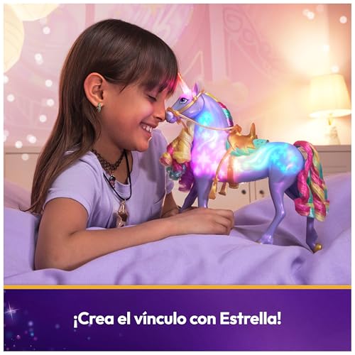 Descubre la magia de Rainbow Light-up Wildstar de Unicorn Academy, un unicornio interactivo de 28 cm que reacciona al tacto con luces de arcoíris y sonidos, inspirado en la serie de NETFLIX.
