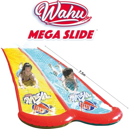 ¡Deslízate al verano con la Doble Pista Deslizante de Wahu! Perfecta para carreras bajo el sol, con adaptador de manguera y parachoques de agua.