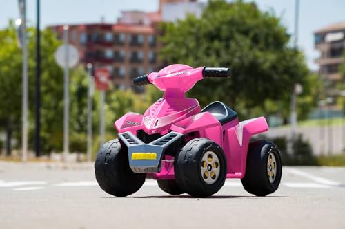 El Feber Quad Racy Rosa es un quad eléctrico diseñado para los más pequeños, ofreciendo seguridad y diversión con su función de marcha adelante y una velocidad máxima de 2 km/h.