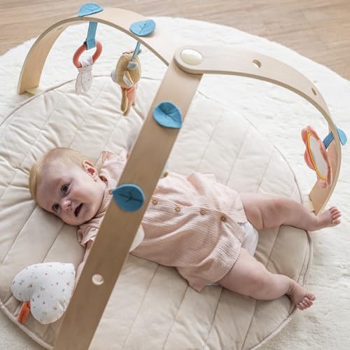 Manta de actividades Nattou de la colección Mila, Zöe & Lana, diseñada para estimular el desarrollo sensorial y motor de los bebés con su suave superficie y arco de madera.